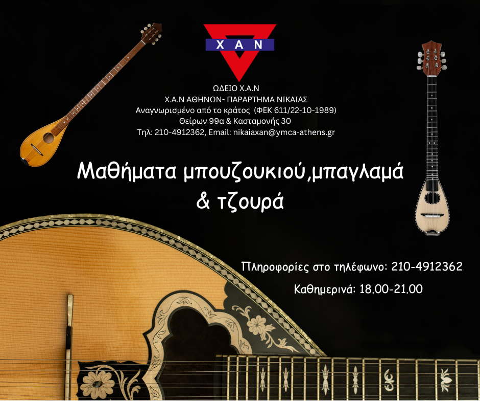 Νέα ΩΔΕΙΟ Χ.Α.Ν ΣΤΗ ΝΙΚΑΙΑ- ΜΑΘΗΜΑΤΑ ΜΠΟΥΖΟΥΚΙΟΥ, ΜΠΑΓΛΑΜΑ & ΤΖΟΥΡΑ 4 Σεπτεμβρίου 2025 | by Konstantinos Tsiklos Περισσότερες πληροφορίες στο τηλέφωνο 210-4912362 ή από κοντά, Καθημερινά: 18.00-21.00